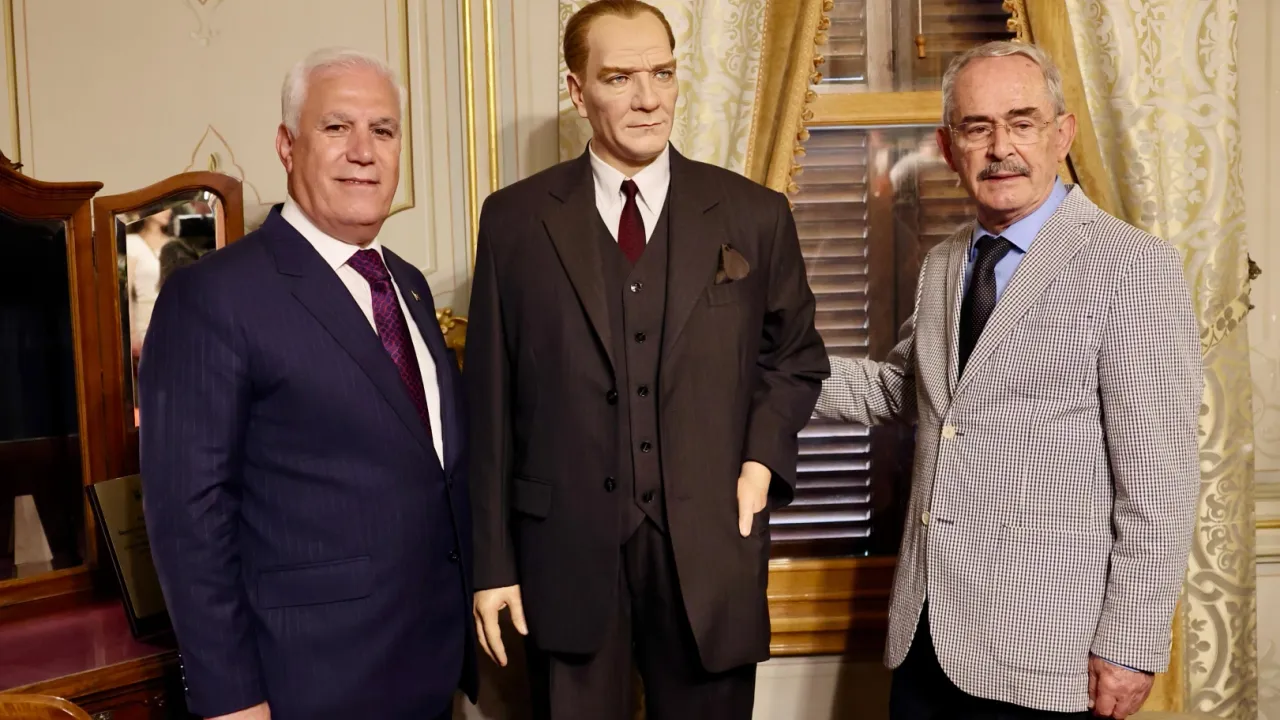 Eskişehir Büyükşehir Belediyesi önceki dönem Belediye Başkanı Prof. Dr. Yılmaz Büyükerşen tarafından hazırlanan balmumu ‘Atatürk Heykeli’ Hünkâr Köşkü’ne kazandırılarak törenle ziyarete açıldı.BURSA (İGFA) - Bursa Büyükşehir Belediyesi, Cumhuriyetimizin kurucusu Ulu Önder Gazi Mustafa Kemal Atatürk’ün aziz hatırasını yaşatmak amacıyla iş insanı Çetin Topal’ın katkılarıyla ve Eskişehir Büyükşehir Belediyesi önceki dönem Belediye Başkanı Prof. Dr. Yılmaz Büyükerşen’in emekleriyle hazırlanan balmumu ‘Atatürk Heykeli’ni Hünkâr Köşkü’nde düzenlenen törenle ziyarete açtı.