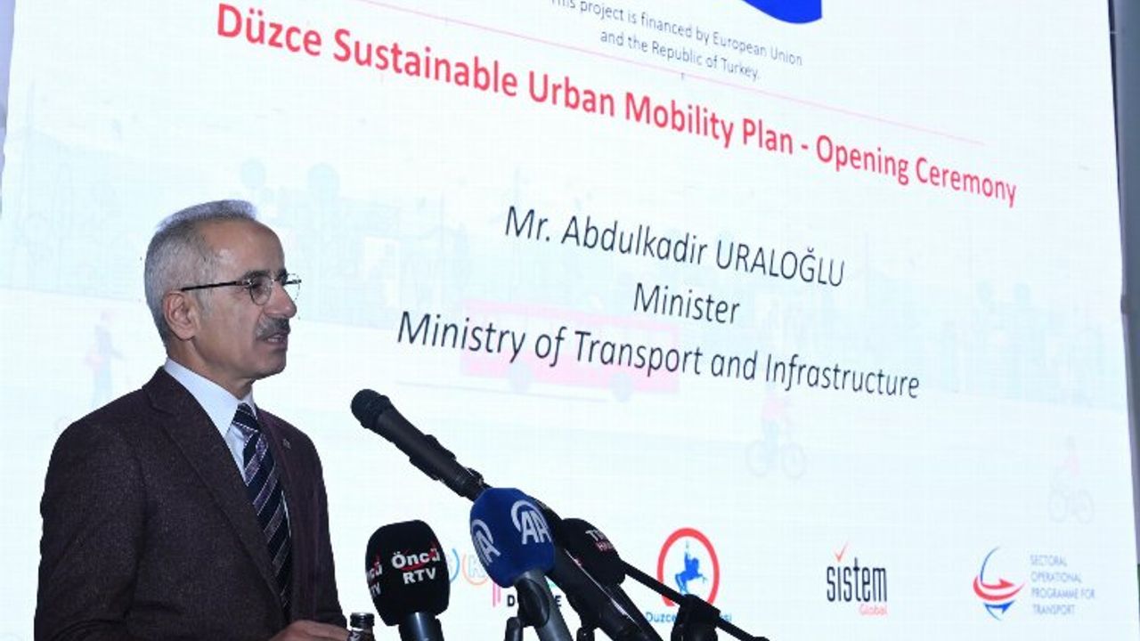 Düzce'de "Sürdürülebilir Kentsel Ulaşım Planı Projesi" açılış törenine katılan Ulaştırma ve Altyapı Bakanı Abdulkadir Uraloğlu, belediyelerimizin kentsel hareketlilik planlarına destek vermeye devam edeceklerini ve hep birlikte daha sürdürülebilir bir ulaşım için çalışacaklarının sözünü verdi.DÜZCE (İGFA) - Ulaştırma ve Altyapı Bakanı Abdulkadir Uraloğlu, Cumhurbaşkanı Recep Tayyip Erdoğan liderliğinde son 21 yılda ülkemize birçok yatırım yaptıklarını belirterek, özellikle ulaştırma alanında birçok projeyi hayata geçirdiklerini kaydetti.