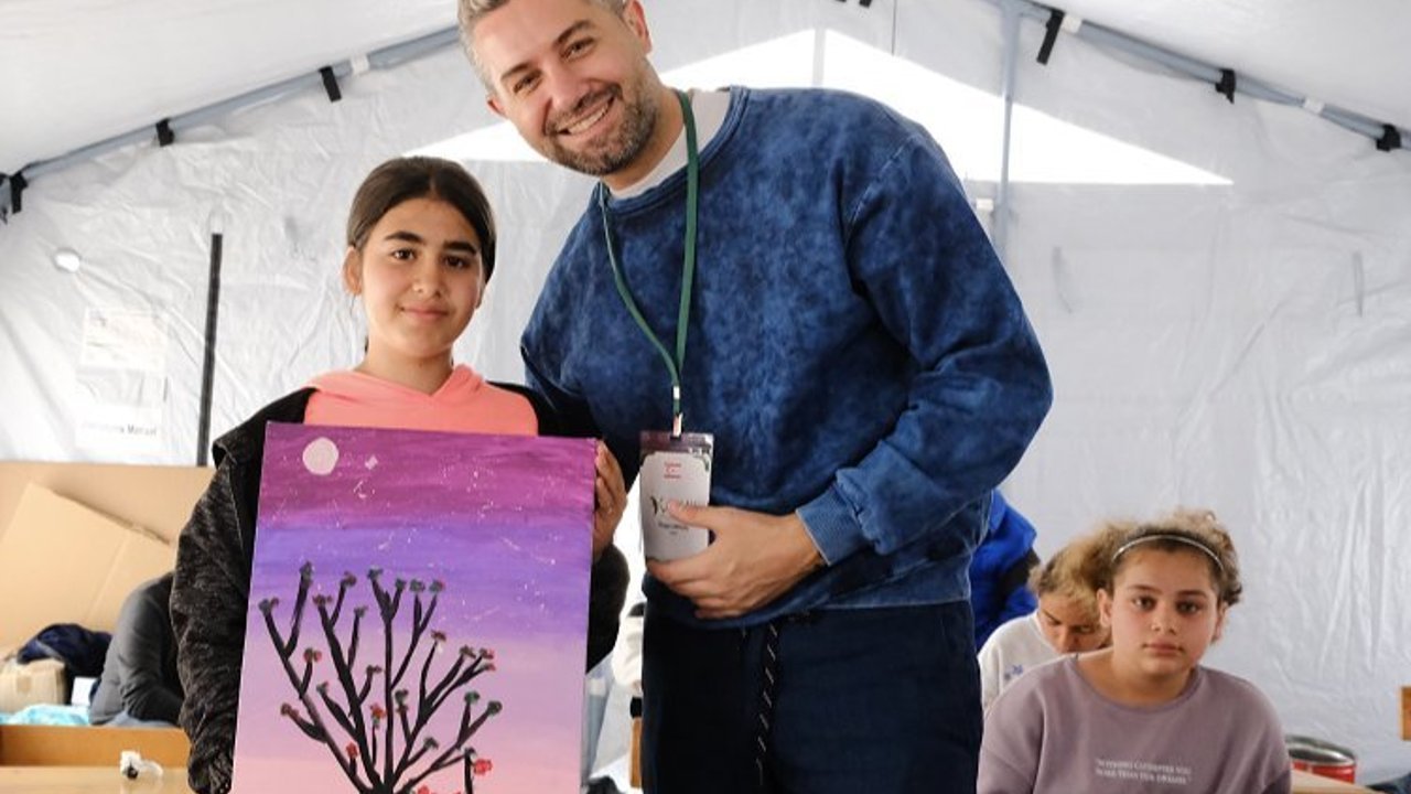 Deprem haberini alır almaz, babasının Mersin’deki iş makinelerini Hatay’a yönlendirerek kurtarma çalışmalarına katılan ünlü iş kadını Abide Gülel’in organize ettiği resimle terapi etkinliği kapsamında; psikiyatristler, pedagoglar, sanatçılar, Yonca Evcimik, İrem Derici, Atakan Işıktutan ve Özgür Aras gibi ünlüler Hatay’a giderek, çadır atölyelerde çocuklarla resim yapmıştı.