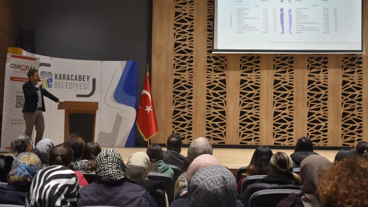 Bursa Karacabey Belediyesi, Dünya Kanser Günü kapsamında Uludağ Onkoloji Dayanışma Derneği (ONKODAY) iş birliği ile önemli bir semine imza attı.BURSA (İGFA) - Bursa Karacabey Belediyesi, Dünya Kanser Günü kapsamında Uludağ Onkoloji Dayanışma Derneği (ONKODAY) iş birliği ile önemli bir seminere imza attı. Kansere karşı bilinç oluşturulması ve erken teşhisin önemine dikkat çekmek amacıyla düzenlenen etkinlik, Ergün Koç Kültür Merkezi'nde gerçekleşti. Özellikle kadınlar tarafından büyük ilgi gören seminere, Karacabey Belediyesi Özel Kalem Müdürü Mehtap Önler de katıldı.