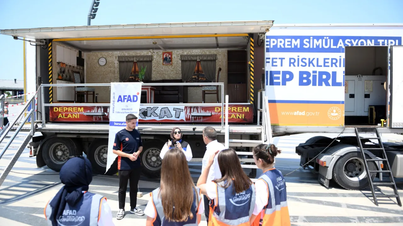 BURSA (İGFA) - Deprem bilinci ve deprem farkındalığı oluşturmak amacıyla Bursa’yı ilçe ilçe gezen Bursa İl Afet ve Acil Durum (AFAD) Müdürlüğü’nün deprem simülasyon TIR’ı, Osmangazi Belediyesi ev sahipliğinde vatandaşlarla buluştu. Osmangazi Meydanı’na kurulan simülasyon TIR’ında, AFAD eğitmenleri vatandaşlara deprem öncesi, sırasında ve sonrasında yapılması gerekenleri uygulamalı olarak anlattı. Eğitime katılanlar, 1999 Marmara Depremi’nde olduğu gibi 7,4 büyüklüğünde bir sarsıntıyı birebir deneyimleyerek “çök, kapan, tutun” hareketini uyguladı.