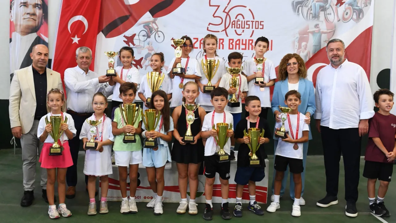 Bursa'da Osmangazi Belediyesi, Gençlik Hizmetleri Spor İl Müdürlüğü ve Tenis Federasyonu Bursa İl Temsilciliği işbirliğinde düzenlenen 3 gün boyunca devam eden 30 Ağustos Zafer Bayramı Tenis Turnuvası’nda dereceye giren sporcular düzenlenen törenle ödüllendirildi.BURSA (İGFA) - 30 Ağustos Zafer Bayramı’na özel Ertuğrul Sağlam Spor Tesisleri’nde 8 yaş gurubundaki çocuklar için düzenlenen turnuvaya katılan sporcular, 3 gün boyunca dereceye girebilmek için birbirleriyle kıyasıya mücadele etti. 52 erkek ve 34 kız olmak üzere toplamda 86 sporcunun katıldığı 30 Ağustos Zafer Bayramı Tenis Turnuvası erkekler kırmızı ve beyaz grup, kızlar kırmızı ve beyaz grup kategorilerinde düzenlendi.