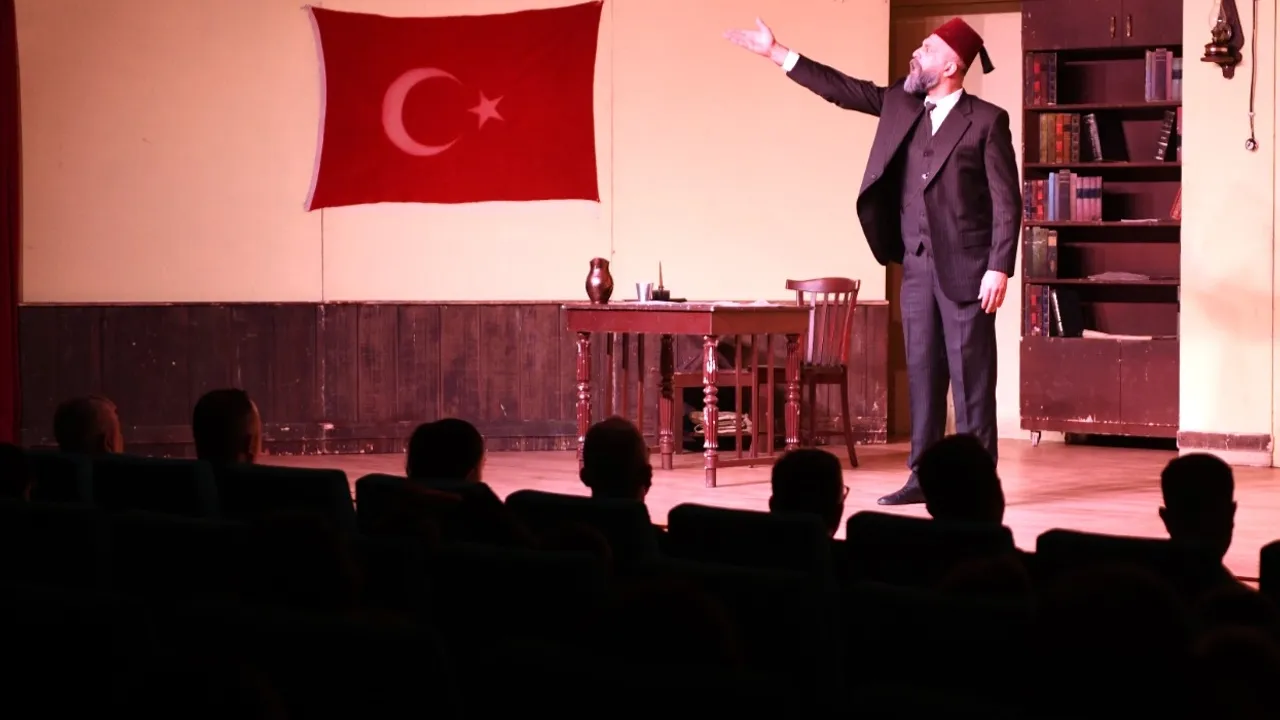 Vatan şairi Mehmet Akif Ersoy’un İstiklal Marşı’nı nasıl ve hangi koşullarda yazdığını anlatan tek kişilik ‘Şair, Şiir, Şuur Mehmet Akif Ersoy’ oyunu, Osmangazi Gösteri Merkezi’nde tiyatroseverlerle buluştu. BURSA (İGFA) -Bursa Devlet Tiyatrosunca gösterimi yapılan ‘Şair, Şiir, Şuur Mehmet Akif Ersoy’ adlı tek kişilik oyun, İstiklal Marşı’nın kabulünün 104. yıldönümünde, Osmangazi Gösteri Merkezi’nde sahnelendi.