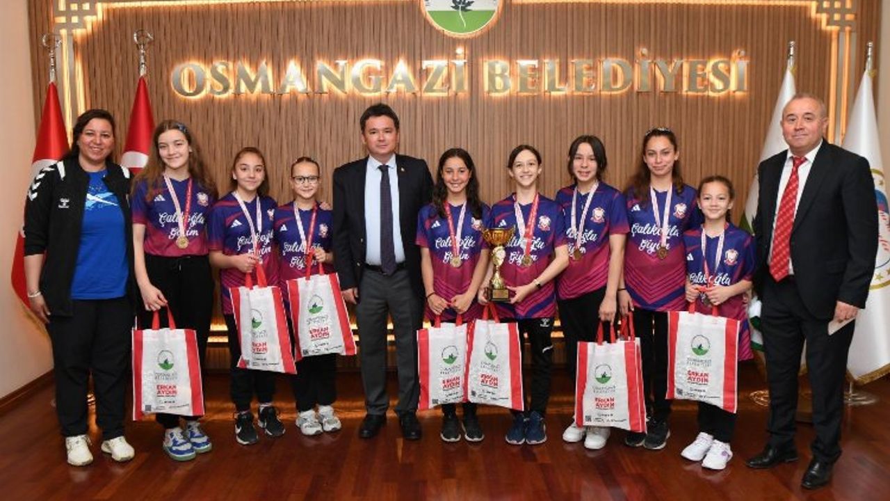 Osmangazi Belediye Başkanı Erkan Aydın, şampiyon sporcuları, okul müdürleri Muhsin Şahin ve beden eğitimi öğretmenleri Ayşe Gökçen ile birlikte makamında kabul etti.