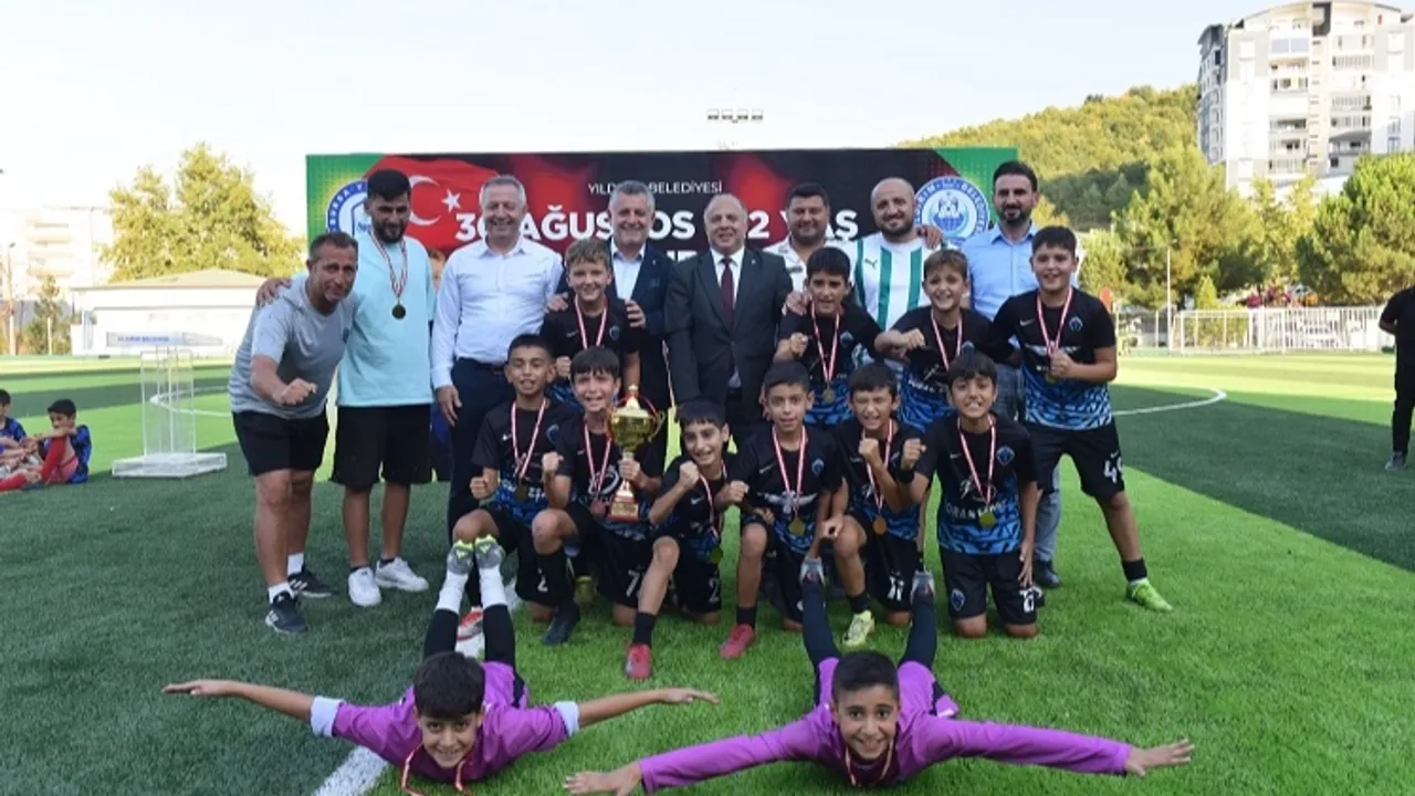 Yıldırım'ı sporda marka kent haline getirecek önemli yatırımları ilçeye kazandıran Bursa Yıldırım Belediyesi, gerçekleştirdiği turnuva ve şampiyonalarla da vatandaşları sporla buluşturmaya devam ediyor.BURSA (İGFA) - 30 Ağustos Zafer Bayramı’nda, spor ve milli bilinci aynı sahada buluşturan Bursa Yıldırım Belediyesi, düzenlediği, ‘30 Ağustos U-12 Yaş Futbol Turnuvası’ ile ilçede futbol şöleni yaşattı. Fidyekızık Spor Tesisi’nde düzenlenen turnuvaya 22 takım ve 350 sporcu katıldı. 5 grup şeklinde oynanan turnuva kıran kırana maçlara sahne oldu. Kardeşlik, dayanışma ve centilmenlik ruhu içinde geçen mücadelelerin ardından; 1. Grup’ta Arabayatağı Spor, 2. Grup’ta Yolspor, 3. Grup’ta Kentspor, 4. Grup’ta Millet Göçmen Spor, 5. Grup’ta ise Karapınar Spor şampiyonluğa ulaştı. Turnuvanın en centilmen takımı ise Samanlıspor oldu.
