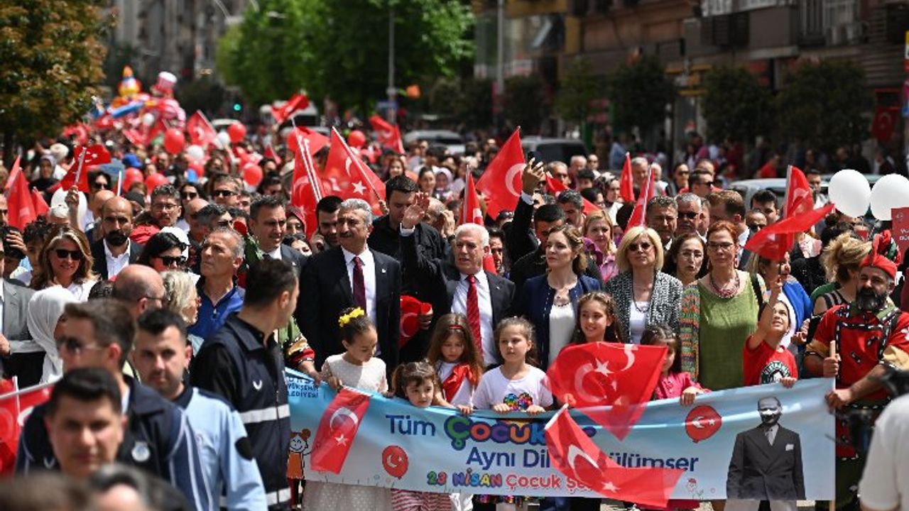 23 Nisan coşkusu, yüzlerce çocuk ve ailelerinin katılımıyla Altıparmak Caddesi’nden Merinos Parkı’na doğru yapılan kortej yürüyüşüyle başladı. Ellerindeki Türk bayraklarıyla marşlar söyleyerek ve şiirler okuyarak yürüyen çocuklara, Büyükşehir Belediye Başkanı Mustafa Bozbey ve eşi Seden Bozbey, CHP İl Başkanı Nihat Yeşiltaş ve Bursa Milletvekili Orhan Sarıbal da eşlik etti.