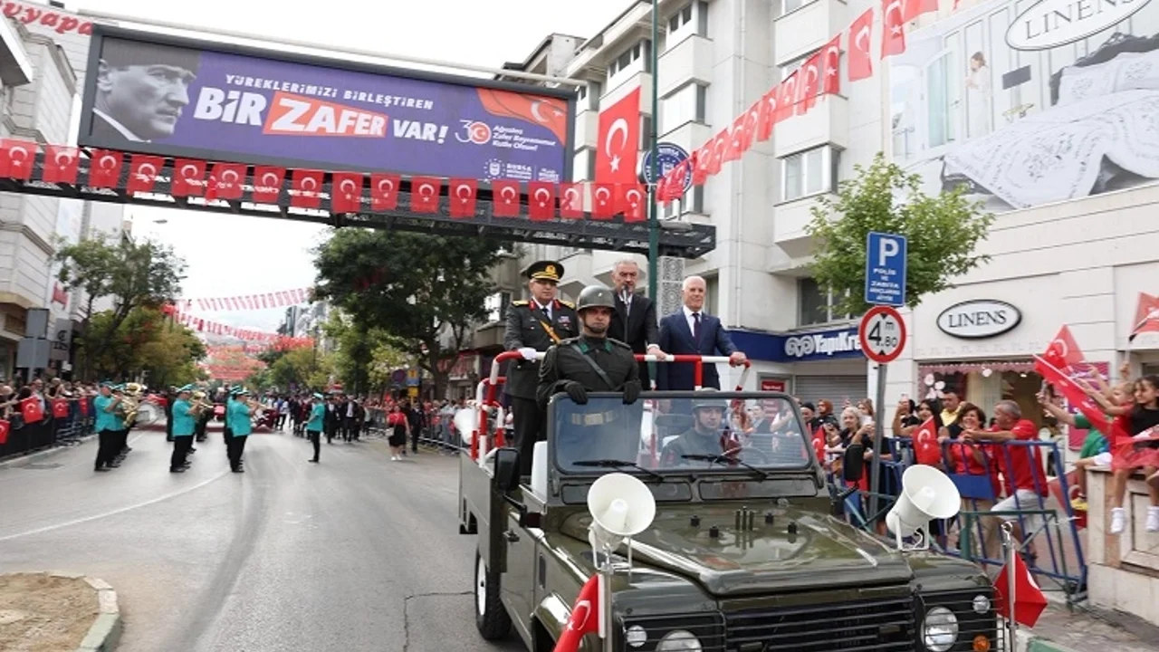 Selamlama sonrası İstiklal Marşı’nın okunmasının ardından Bursa Erkek Lisesi öğrencileri Ege Ayberk Men ve Tuana Naz Muşlu tarafından şiir okundu. Daha sonra Yıldırım, Nilüfer ve Osmangazi Belediyesi Halk Oyunları ekipleri gösterilerini sundu. Askeri Veteriner Okulu Eğitim Merkez Komutanlığı ve Garnizon Komutanlığı adına günün anlam ve önemini belirten konuşma yapılmasının ardından Bursa Mehteren Takımı ve Tahtakıran Kılıç Kalkan Halk Oyunları Derneği ekipleri sahne aldı. Program resmi geçitle devam etti. Ellerindeki bayraklarla törenlere eşlik eden Bursalılar, 30 Ağustos Zafer Bayramı coşkusunu birlikte yaşadı.