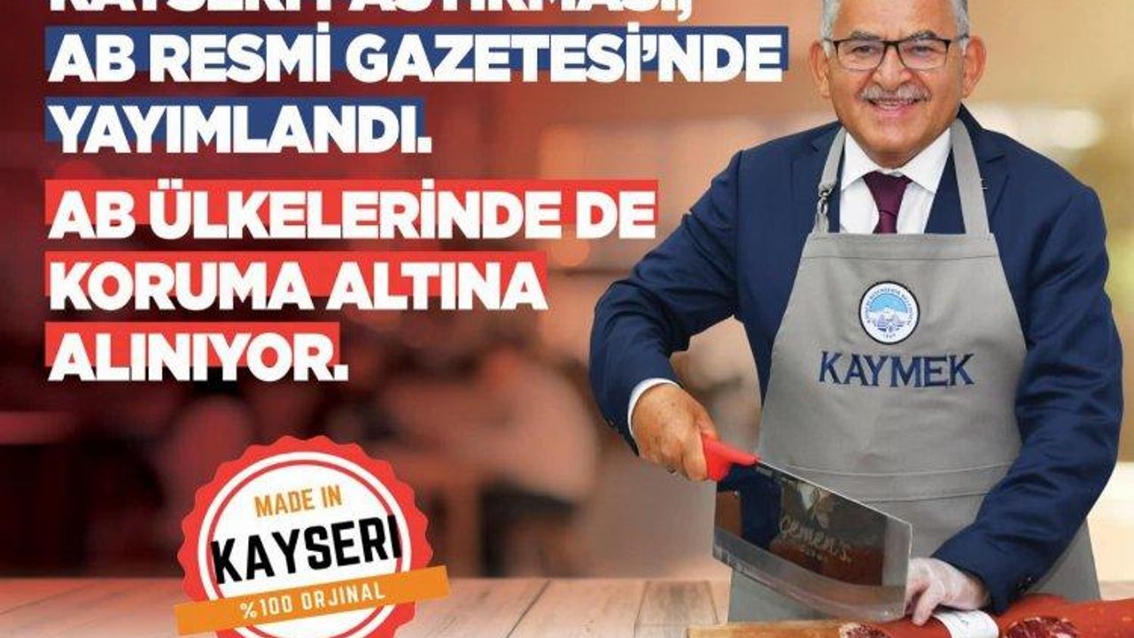 Kayseri Büyükşehir Belediye Başkanı Dr. Memduh Büyükkılıç, Kayseri pastırmasının Avrupa Birliği nezdinde tescil başvurusuna ilişkin kararın AB Resmi Gazetesi’nde yayımlandığını duyurdu.Mehmet UZEL / KAYSERİ (İGFA) - Tarihi ve doğal güzelliklerinin yanı sıra kültür sanat çeşitliliği ve gastronomi lezzetleri ile zenginlikler şehri Kayseri’nin tüm değerlerine sahip çıkan Başkan Dr. Memduh Büyükkılıç, kentin markası pastırmanın tescil başvurusunun AB Resmi Gazetesi’nde yayımlandığını duyurdu.