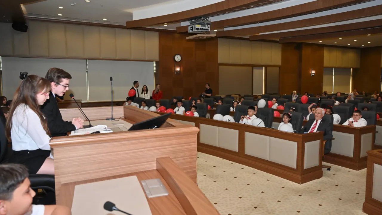 Bursa Kent Konseyi Çocuk Meclisi öncülüğünde 17 ilçeden gelen çocuklar, Büyükşehir Belediye Başkanı Mustafa Bozbey’in ve meclis üyelerinin koltuklarına oturarak Bursa’nın geleceğine ilişkin kararlar aldı. Başkan Bozbey, “Ulu Önder Mustafa Kemal Atatürk’ün Cumhuriyet’i emanet ettiği çocukları ve gençleri, geleceğimiz olarak görüyoruz. Kent yöneticileri olarak çocuklarımıza kulak vermeliyiz” dedi.BURSA (İGFA) - 23 Nisan Ulusal Egemenlik ve Çocuk Bayramı ile TBMM’nin açılışının yıl dönümü kutlamaları kapsamında ‘Bursa Büyükşehir Belediye Meclisi Çocuk Oturumu’ Başkan Bozbey’in katılımıyla gerçekleşti. Bursa Büyükşehir Belediye Başkanı Mustafa Bozbey’in koltuğuna oturan Bursa Kent Konseyi Çocuk Meclisi Başkanı Yağız Vatansever ve Çocuk Meclisi yürütme kurulu üyesi İnci Bade Yiğit, çocuklar adına oturum başlangıç konuşmasını gerçekleştirdi.