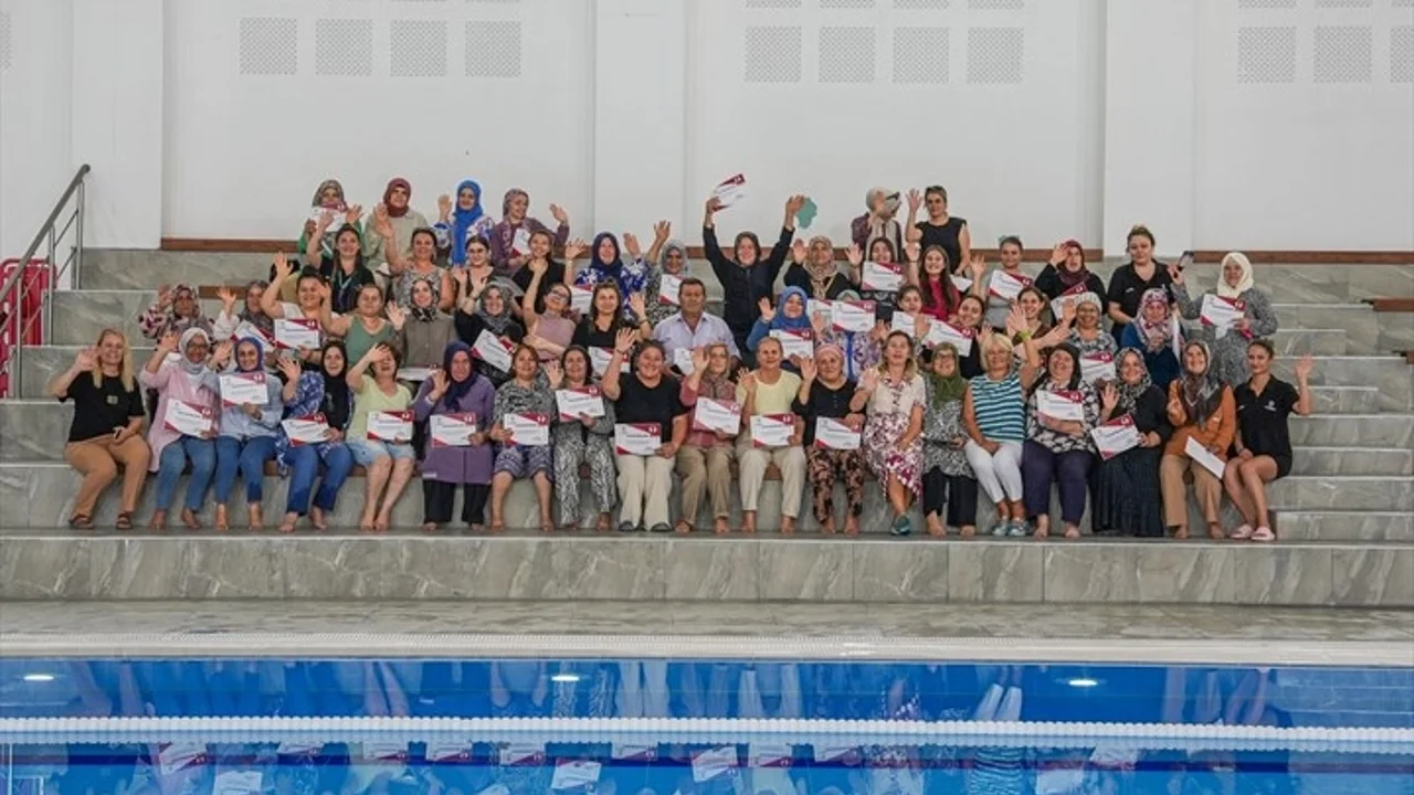 Denizli Büyükşehir Belediyesi tarafından kadınlara yönelik olarak hayata geçirilen “Yüzme Bilmeyen Kalmasın” projesi tüm hızıyla sürüyor. Proje kapsamında, Anafartalar-Dokuzkavaklar Kapalı Yüzme Havuzu’nda Pınarkent, Küçükdere, Yeniköy ve Irlıganlı mahallelerinde ikamet eden yaklaşık 80 kadın kursiyer, haftanın iki günü aldıkları eğitimlerle temel yüzme becerilerini kazandı.DENİZLİ (İGFA) - Eğitimlerin sonunda düzenlenen törenle katılımcılara başarı sertifikaları verildi. Programa, Denizli Büyükşehir Belediye Başkanı Bülent Nuri Çavuşoğlu’nun eşi Nilgün Çavuşoğlu da katıldı. Kadınlarla bir araya gelen Nilgün Çavuşoğlu, hem tebrik etti, hem de yaşadıkları bu özel süreci dinleyerek onların mutluluğuna ortak oldu. Törene Gençlik ve Spor Hizmetleri Dairesi Başkanı Ayşe Sarıkaya da eşlik etti.