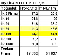 TÜİK diyor ki, ilk 50 firma ihracatın yüzde 41’ini, ithalatın ise neredeyse yüzde 50’sini gerçekleştirirler. İlk 100 diye biraz genişletirseniz, ihracattaki payları yüzde 50’ye, ithalattaki payları yüzde 60’a yaklaşıyor.