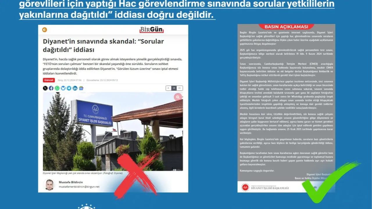 Dezenformasyonla Mücadele Merkezi'nden yapılan açıklamada, bazı basın yayın organlarında yer alan “Diyanet İşleri Başkanlığının sağlık görevlileri için yaptığı Hac görevlendirme sınavında sorular, yetkililerin yakınlarına dağıtıldı” iddiası doğru olmadığının altı çizildi.