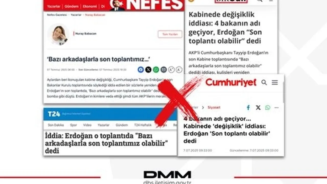 Dezenformasyonla Mücadele Merkezi, Cumhurbaşkanı Erdoğan’ın Kabine toplantısında “Bazı arkadaşlarla son toplantımız olabilir” dediği iddialarını yalanladı. İddialar, manipülasyon amaçlı ve gerçeği yansıtmıyor.ANKARA (İGFA) -“Dezenformasyonla Mücadele Merkezi, bazı basın organları ve sosyal medyada yer alan, “Cumhurbaşkanı Recep Tayyip Erdoğan’ın son Kabine toplantısında ‘Bazı arkadaşlarla son toplantımız olabilir’ dediği” yönündeki iddiaların gerçeği yansıtmadığını duyurdu.