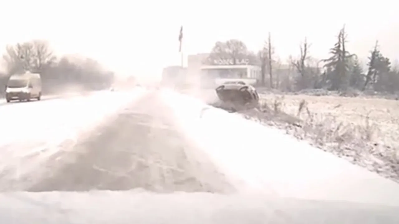 Düzce'de kar yağışı etkisini sürdürürken yeni açılan Çevre Yolu'nda sürücüsünün direksiyon hakimiyetini kaybettiği hafif ticari araç tarlaya devrildi. Kaza anı kameraya yansıdı.Sefer Demir / DÜZCE (İGFA) - Düzce'de yapılan uyarılarla birlikte etkisini gösteren kar yağışı il genelinde etkili oldu.