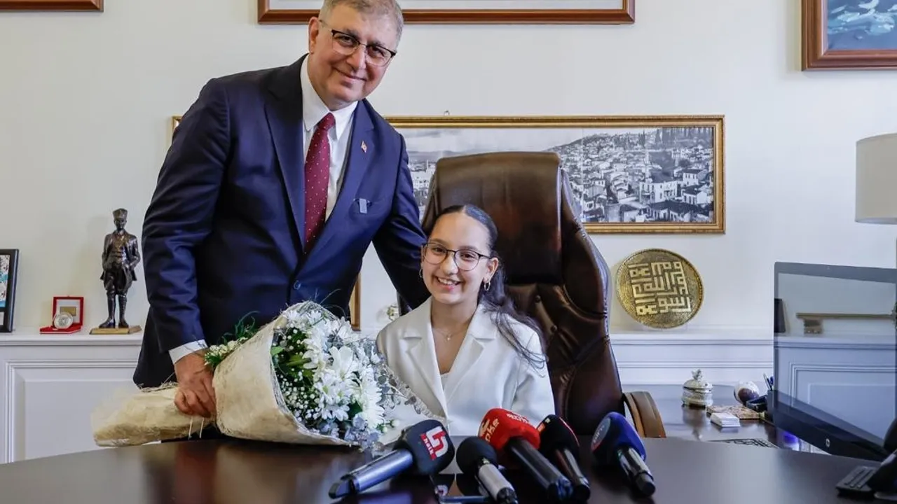 İzmir Büyükşehir Belediye Başkanı Dr. Cemil Tugay, 23 Nisan Ulusal Egemenlik ve Çocuk Bayramı'nda koltuğunu ortaokul 6. sınıf öğrencisi ve İzmir Çocuk Meclisi sözcüsü olan Derin Taş'a bıraktı. 12 yaşındaki Taş, geri dönüşüm ve doğa için çalışmak istediğini belirtti.İZMİR (İGFA) - İzmir Büyükşehir Belediye Başkanı Dr. Cemil Tugay, Ulu Önder Gazi Mustafa Kemal Atatürk'ün dünya çocuklarına armağan ettiği 23 Nisan Ulusal Egemenlik ve Çocuk Bayramı'nda koltuğunu İzmir Çocuk Meclisi sözcüsü, Atakent Erdoğan Kibarer Ortaokulu 6. sınıf öğrencisi 12 yaşındaki Derin Taş'a devretti.