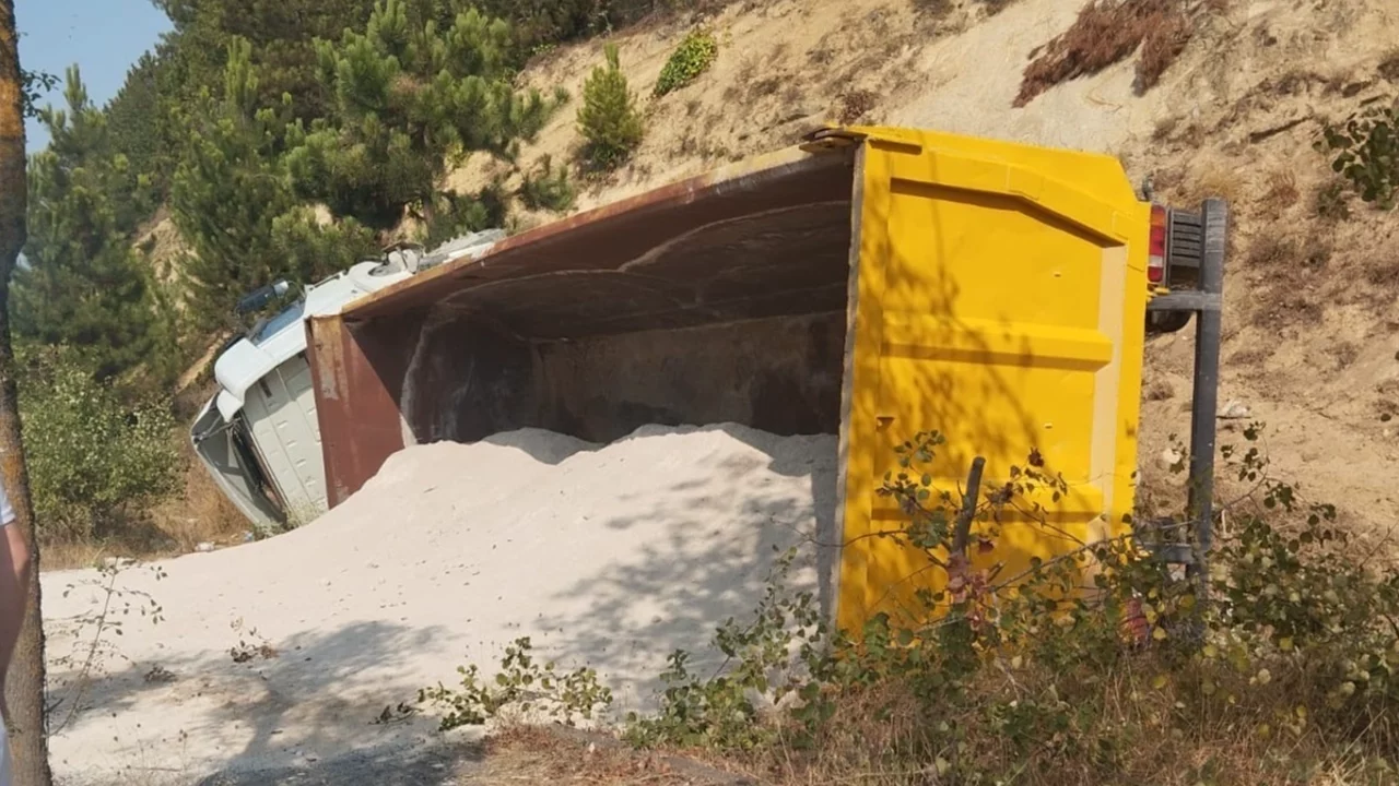 DÜZCE (İGFA) - Yerleşim alanı ve diğer araçların bulunduğu bölgede kontrolü kaybeden sürücü, ani bir kararla direksiyonu dağ tarafına çevirerek kamyonun devrilmesini sağladı. Devrilme sonucu kamyonun kasasındaki kum yola saçıldı.