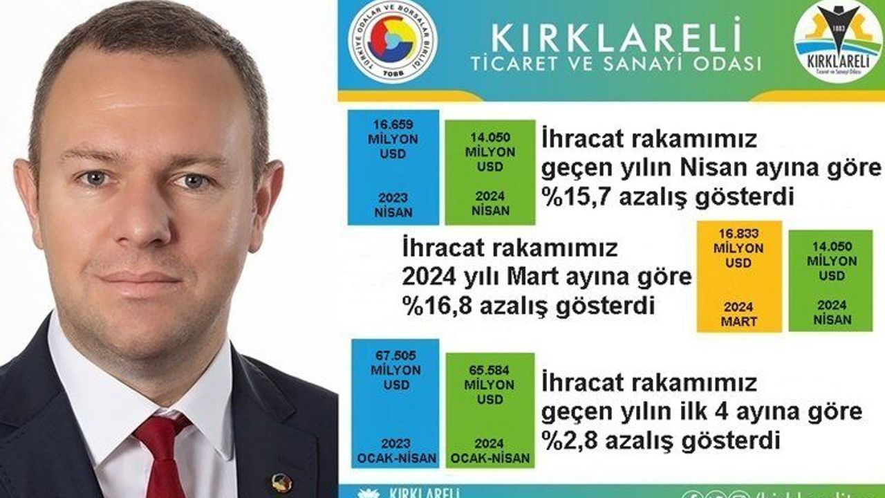 Ilık konuyla ilgili yaptığı açıklamasında, Kırklareli merkezli firmaların 2024 Nisan ayında 14 bin 50 milyon dolar ihracat rakamına ulaştığını ifade ederek, "2024 yılı Nisan ayında ilimizden yapılan İhracat 2024 yılı Mart ayına göre yüzde 16,8 azalış, 2023 yılının Nisan ayına göre ise de yüzde 15,7 azalış gösterdi. 2024 yılının ilk 4 ayında Kırklareli’nden yapılan ihracat rakamı toplamı 65 bin 584 milyon dolara yükselerek, 2023 yılının ilk 4 ayına kıyasla yüzde 2,8’lik bir azalış gösterdi" dedi.