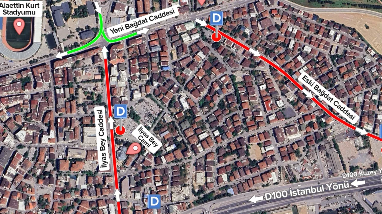Yeni trafik düzenlemesi kapsamında İlyasbey Caddesi’ni kullanarak, D-100 Kuzey yan yol istikametine giden 320, 409, 415, 425, 435A, 490, 560 ve 590 numaralı toplu taşıma hatları, yeni düzenlemeye göre Eski Bağdat Caddesi üzerinden hizmet vermeye başlayacak.