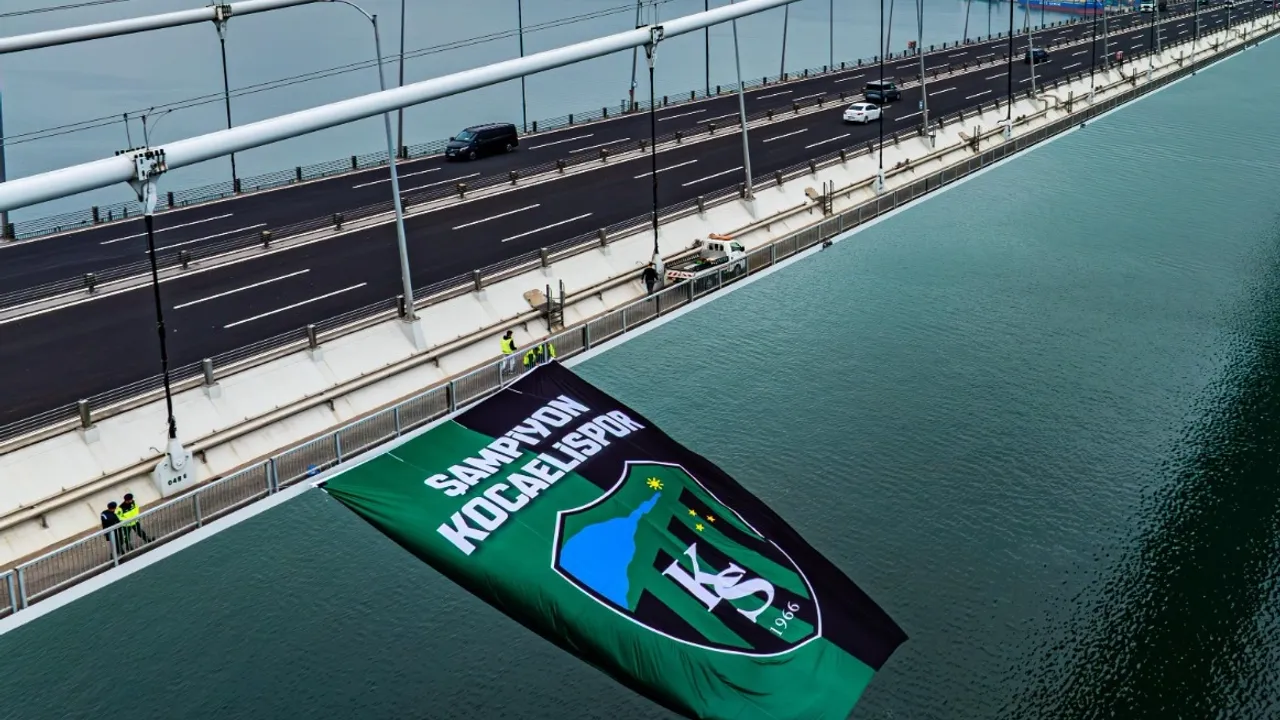 Trendyol 1.Lig’de bitime 3 hafta kala şampiyonluğunu ilan ederek Süper Lig hasretine 16 yıl sonra son veren Kocaelispor’un şampiyonluk bayrağı dünyanın en büyük orta açıklığına sahip, İzmit Körfezi’nin üzerinden geçen Osmangazi Köprüsü’ne asıldı.
