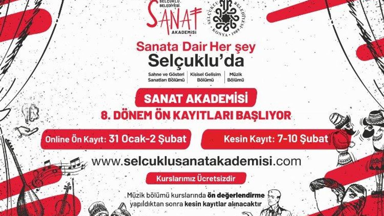 31 Ocak’ta www.selcuklusanatakademisi.com adresinden gerçekleştirilecek ön kayıtlar 2 Şubat’ta sona erecek. Selçuklu Belediyesi Tiyatro Müdürlüğü’nce gerçekleştirilen etkinliklerle yıl boyunca şehrin kültür ve sanat hayatına canlılık katan akademide eğitimler ücretsiz olarak verilecek.