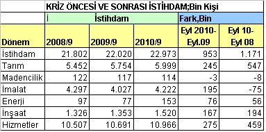 Bu yılın Eylül ayı itibariyle istihdam 23 milyona yaklaşmış görünüyor. Bu 2009 Eylül’üne göre, neredeyse 1 milyon yeni istihdam gibi duruyor. Yani krizden çıkarken ekonomi krizde işini kaybedenlere işini geri kazandırmış. Gayet iyi. Bir de krize girilmeden istihdam ne kadardı ,ona bakalım. Yaklaşık 22 milyon kadar. Yani, krizde yaşanan iş kayıpları 2009 ortalarından itibaren ekonomi canlanırken telafi edilmiş hatta, üstüne istihdam yaratılmış. Acaba öyle mi? Bir de sektörlere bakalım. Ne görüyoruz? İstihdam artışlarında, tarım önemli bir yer tutuyor. . Kriz öncesine göre tarım istihdamı 550 bine yakın artmış, geçen Eylüle göre de 250 bin artmış. Peki ne oldu tarımda da bu istihdam yaşandı?