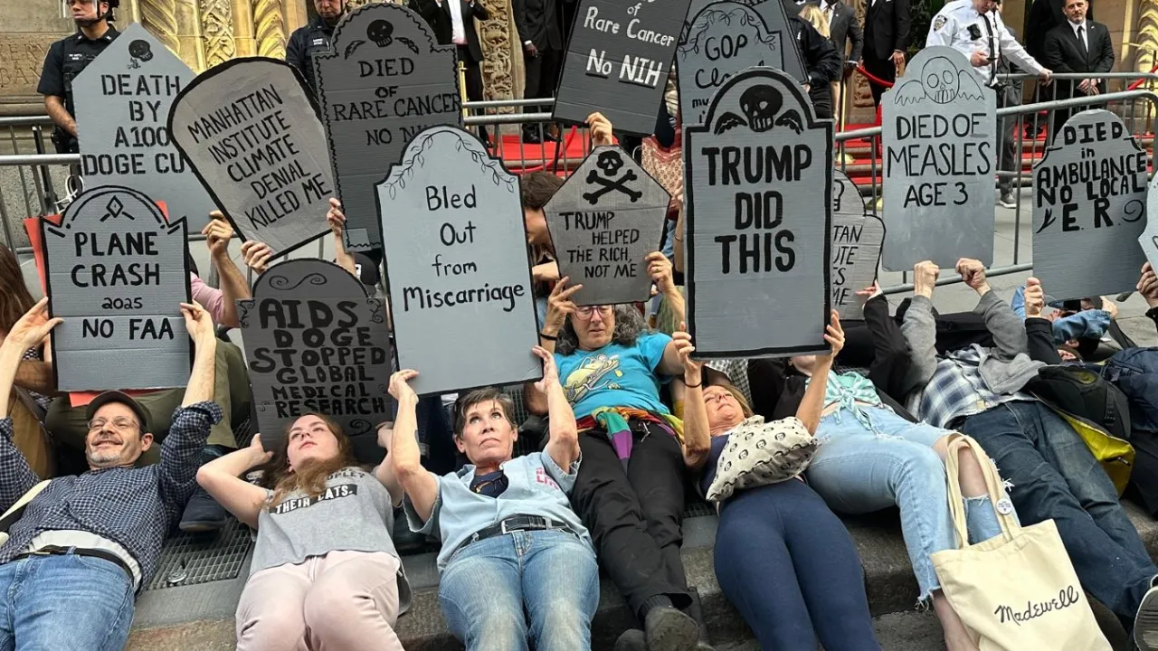 Protestoda, “ölüme gömülme” temalı bir performans sergilendi. Göstericiler yere yatarak ellerinde “Milyarder vergi kesintileri beni öldürdü”, “Trump zenginlere yardım etti, bana değil” yazılı karton mezar taşları tuttu. Lüks araçlarla gelen gala konukları, bu sessiz çığlıkla karşılaştı. Konuklar arasında, geçen yıl metroda bir kişinin ölümüne neden olan ve beraat eden eski deniz piyadesi Daniel Penny’nin bulunması, öfkeyi daha da artırdı.