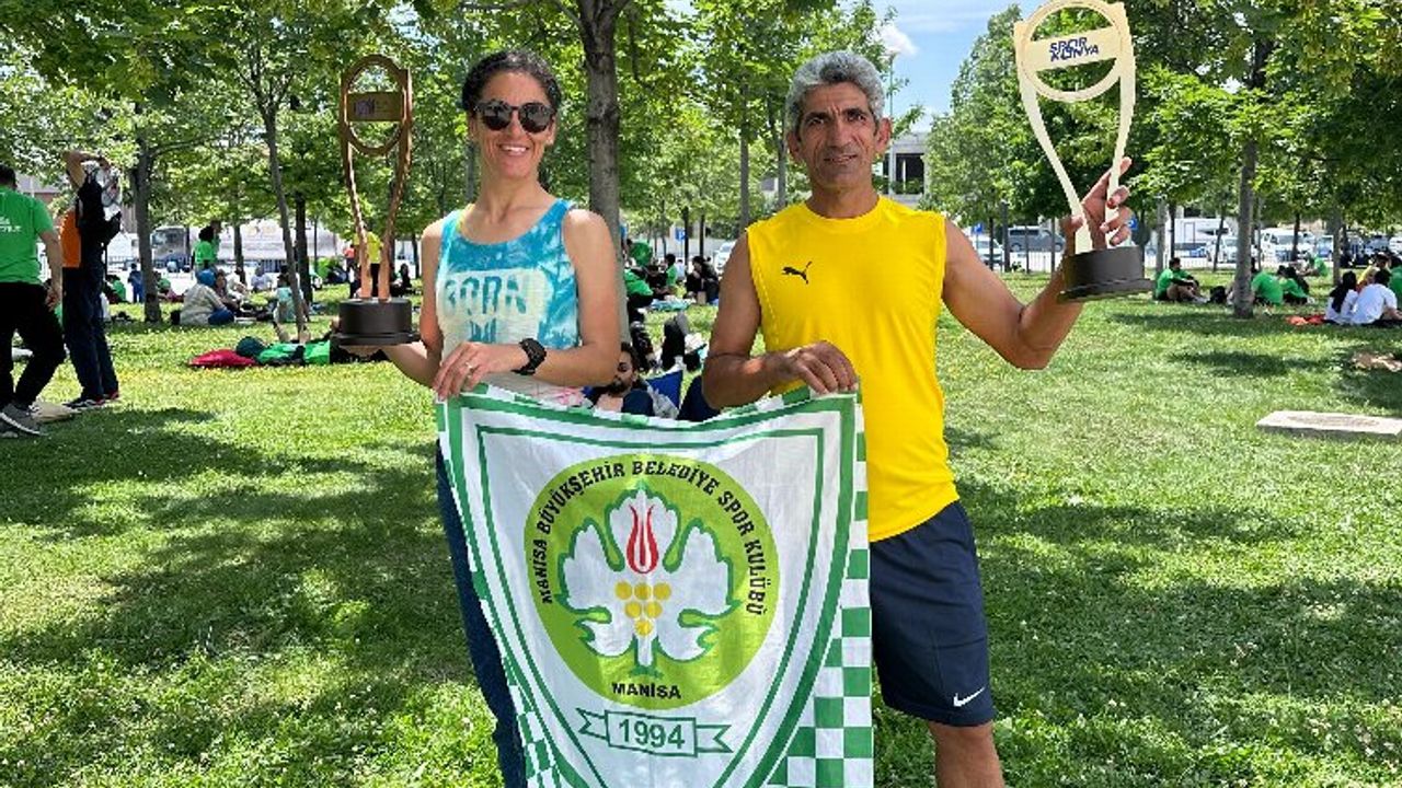 Konya Büyükşehir Belediyesi tarafından bu yıl üçüncüsü düzenlenen “Uluslararası Konya Yarı Maratonu” 31 ülkeden binlerce sporcunun katılımıyla yapıldı. Manisa Büyükşehir Belediyesporlu Ahmet Bayram yarı maratonda 50-54 yaş kategorisinde zirvede yer alırken; Özlem Işık da 10 kilometre koşusunda üçüncü oldu. KONYA (İGFA) - Konya Büyükşehir Belediyesi, Selçuklu Otizmli Bireyler Vakfı (SOBE), Meram Down Sendromlu Bireyler Yaşam Destek Merkezi (DOSD MERAM) ile Karatay Alzheimer Gündüz Yaşam Merkezi işbirliğinde 3. Uluslararası Konya Yarı Maratonu düzenlendi. Manisa Büyükşehir Belediyesporlu atletler Ahmet Bayram ve Özlem Işık, 31 ülkeden binlerce sporcunun katılımıyla gerçekleştirilen koşuda, başarılı sonuçlar elde etti. 21 kilometrelik yarı maratona katılan Ahmet Bayram, 1 saat 17 dakika 18 saniyelik sonucuyla 50-54 yaş grubunda zirvede yer aldı. Bayram’ın ardından Nihat Özkaymak ikinci, Murat Kaya da üçüncü sıranın sahibi oldu. 10 kilometre kadınlar koşunda Esmanur Yılmaz şampiyonluk ipini göğüslerken, Dilan Çukurcam ikinci, yarışı 43 dakika 43 saniyede tamamlayan Manisa Büyükşehir Belediyesporlu Özlem Işık da üçüncü sırada tamamladı. Ahmet Bayram ve Özlem Işık, kazandıkları kupalarla poz vererek, yarışı başarılı bir şekilde tamamlamanın mutluluğunu yaşadılar.