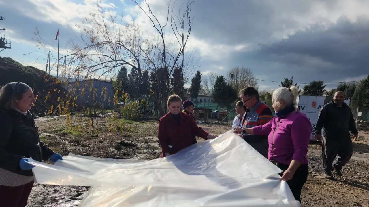 Köpeklerin kulübelerini tamir eden çalışma grubu üyeleri, yağmur ve soğuk hava şartlarından korumak için naylon çekerek onların korunmalarını sağlarken, mama desteğinde de bulundu.
