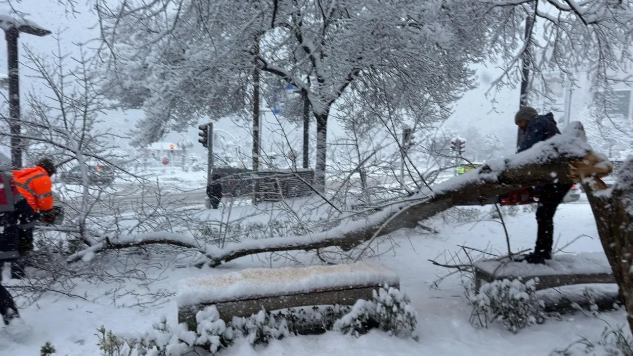 Kent merkezinde yoğun kar yağışı nedeniyle bazı ağaçlar karın ağırlığına dayanamayarak devrildi.