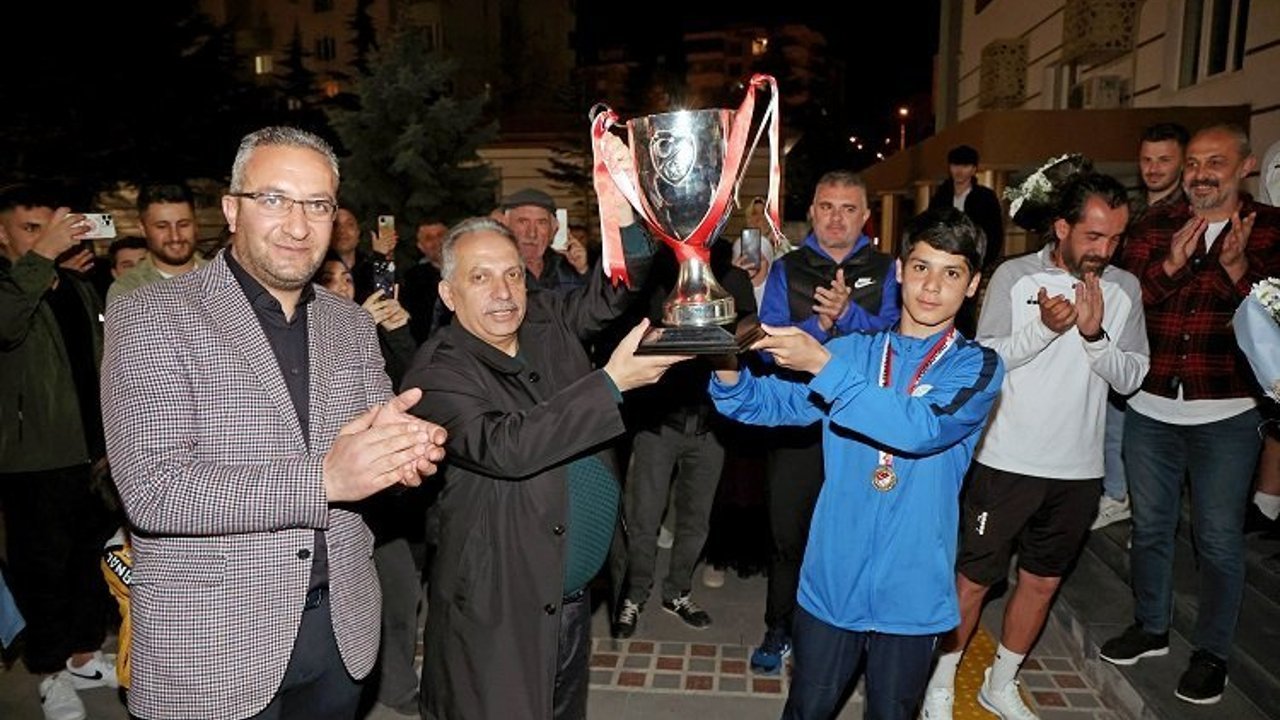 Kayseri Talas Belediye Başkanı ve Talasgücü Onursal Başkanı Mustafa Yalçın, Türkiye Şampiyonu olarak büyük bir başarıya imza atan Talasgücü Belediyespor U14 takımını ve teknik heyetini çiçeklerle karşıladı.