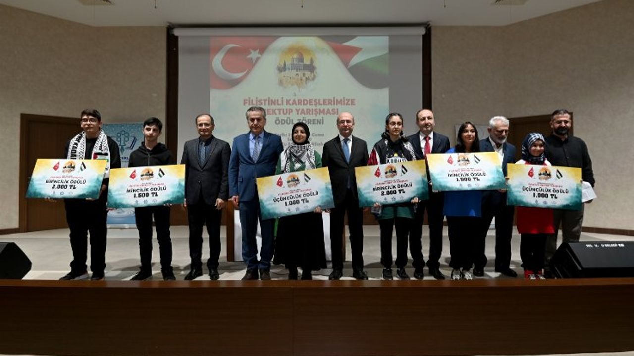 Konya'da Selçuklu Belediyesi ve Selçuklu Milli Eğitim Müdürlüğü iş birliği ile düzenlenen “Filistinli Kardeşlerimize Mektup” isimli yarışmanın ödülleri sahiplerini buldu. Duygu dolu cümlelerini kağıda döken öğrenciler Filistin’de yaşanan zulme bir kez daha dikkat çekti.KONYA (İGFA) - Filistin’de yaşanan vahşete dikkat çekmek amacıyla düzenlenen “Filistinli Kardeşlerimize Mektup” yarışmasının ödülleri düzenlenen törenle kazanan öğrencilere verildi. Selçuklu Belediyesi ve Selçuklu İlçe Milli Eğitim Müdürlüğü işbirliği ile ortaokul ve lise kategorisinde düzenlenen yarışmaya 36 okul başvuru yapmıştı.