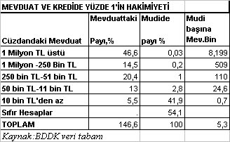 Bizde bankalarda 564 milyar TL mevduat var. Bunun 380 milyar TL kadarı tasarruf mevduatı. Görünürde, banka cüzdanı sayısı 75 milyon kadar. Bu, 75 milyon kişi demek değil. Bir kişinin 5- 10 hesabı olabilir. Şimdi bakın ne durumdayız: Bankalarda 1 milyon TL’nin üstünde mevduatı olan cüzdanlar onbinde 3 ama, bu mutlu azınlığın toplam mevduattaki payı yüzde 46,6. Bankadaki birikimi 250 bin TL ile 1 milyon TL arasında olan rantiyelerin toplam cüzdan sahipleri arasındaki oranı binde 2, ama mevduattaki payları yüzde 14,5. Şimdi, birikimi 250 bin TL’nin üstünde olan rantiyelere toptan bakalım: Sayıları binde 2,3 ama paranın yüzde 61’ine sahipler. Onlara, 50 bin liranın üstünde birikimi olan cüzdanları eklersek ne oluyor: Cüzdanların yüzde 1,2 kadarı bankalardaki paranın yüzde 80 küsuruna hakim. Bunlar, öyle böyle değil, bankaların yılda verdiği 35 milyar faizin yüzde 80’ini alıyorlar. Hesap sayısı 75 milyon ama bunun yüzde 54’ünde para yok. Öyle olunca mevduatın yüzde 80’ine sahip olanları yüzde 1 değil de yüzde 2 yapalım, sonuç yine değişmez…