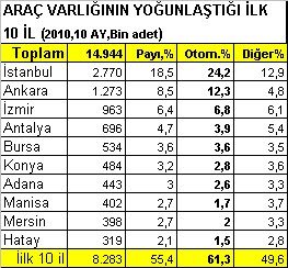 Otomotiv parkının 2010 itibariyle illere dağılımına bakıldığında, 81 il arasında ilk 10 ilin, araç varlığının yüzde 55’ine sahip olduğunu, otomobillerin de yüzde 61’inin 10 ilde toplandığını görüyoruz. İlk sırada tabii ki İstanbul var ve toplam motorlu taşıtların yüzde 18,5’unu barındırıyor.