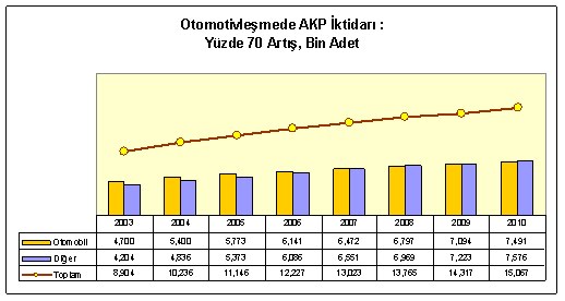AKP’nin ilk iktidar yılı olan 2003 sonunda 9 milyonu bulmayan motorlu kara taşıtı sayısı, 2010 sonunda 15 milyonu aştı. Bu, geçmiş 7 yılda trafiğe çıkan araç sayısının yüzde 70’in üstünde artması demektir ki, korkunç bir tırmanmadır . Özellikle trafiğe çıkan otomobil sayısındaki patlama dikkat çekicidir. 2003’te trafikte 4,7 milyon otomobil varken 2010 sonunda sayı 7,5 milyona yaklaşmıştır. Bu, 7 yılda trafikteki otomobil sayısının yüzde 60 artmasıdır.