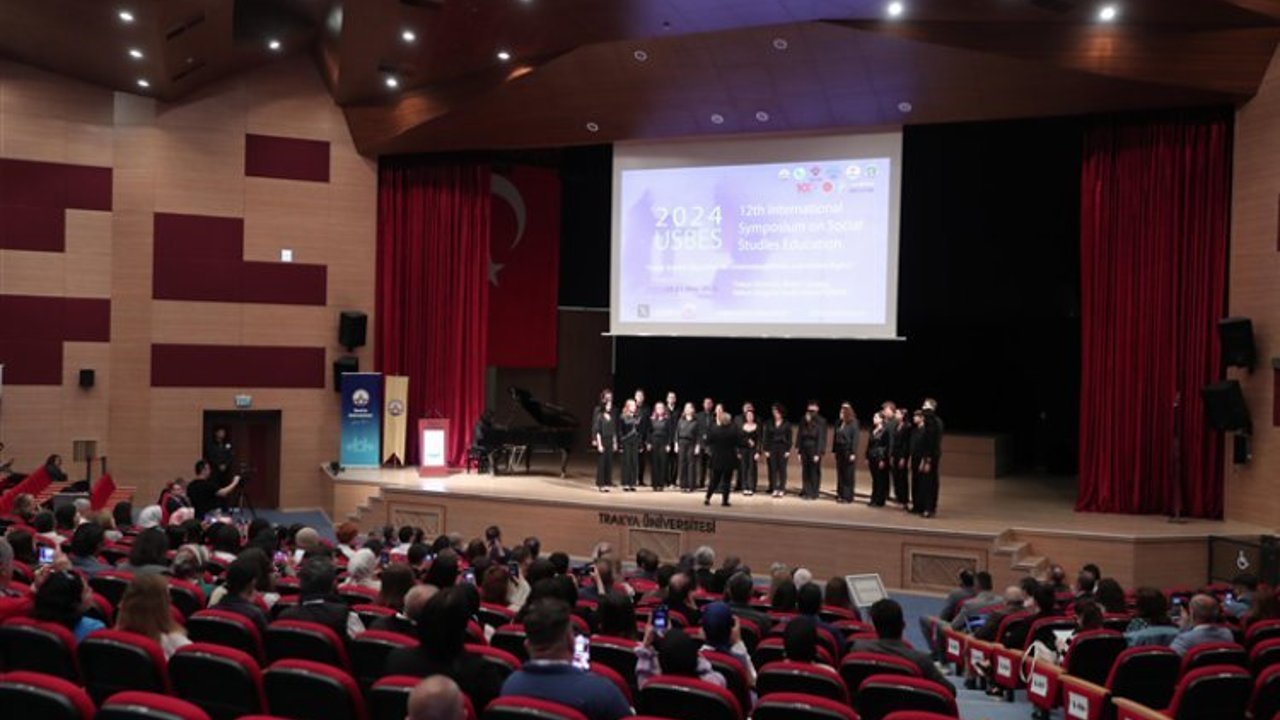 Trakya Üniversitesi ile Sosyal Bilgiler Eğitimcileri Birliği Derneği (SBEBD) iş birliğiyle gerçekleştirilmekte olan Uluslararası Sosyal Bilgiler Eğitimi Sempozyumu (USBES), Balkan Kongre Merkezinde gerçekleştirildi.EDİRNE (İGFA) - Program, saygı duruşu ve İstiklal Marşı’nın okunmasının ardından Öğr. Gör. Zübeyde Omurtay’ın yönettiği Trakya Üniversitesi Eğitim Fakültesi Müzik Eğitimi Ana Bilim Dalı Çok Sesli Korosu ve Balkan Çok Sesli Gençlik Korosu’nun konseri ve folklor gösterisi ile başladı.
