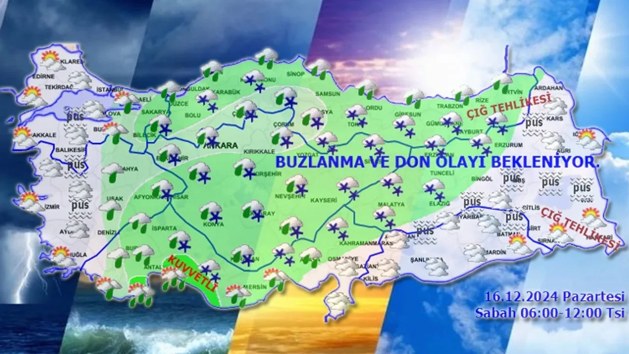 Kıyı kesimlerde sağanak, iç kesimlerde yağmur ve karla karışık yağmur, iç kesimlerin yükseklerinde kar olarak görülmesi beklenen yağışların, Antalya'nın doğu kıyılarında yerel kuvvetli olacağı tahmin ediliyor. Ülkemizin iç ve doğu kesimlerinde buzlanma ve don ile birlikte pus ve yer yer sis görüleceği tahmin edilirken, Doğu Karadeniz’in iç kesimlerinin yüksekleri ile Doğu Anadolu’nun doğusunun dik ve eğimli yamaçlarında çığ tehlikesi bulunduğu bildirildi.