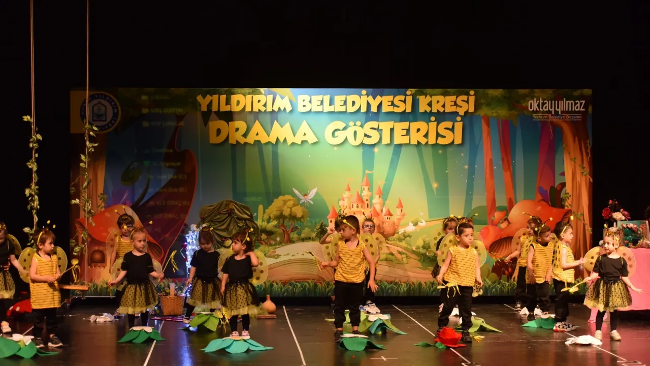 Yıldırım Belediyesi Kreşi öğrencilerinin yıl sonu gösterisi, ayakta alkışlanırken, ailelere duygusal anlar yaşattı.BURSA (İGFA) - Yıldırım Belediyesi Kreşi öğrencileri hünerlerini sergiledi. 4 sınıfta, 76 öğrencinin öğrenim gördüğü Kreş’in öğrencileri Barış Manço Kültür Merkezi’nde düzenlen yılsonu etkinliğinde, sergiledikleri drama gösterileri, müzikal ve çeşitli oyunlarla hem kendileri eğlendi hem de velilere keyif dolu anlar yaşattı. Çocuklarını sahnede gören bazı veliler duygulanırken, miniklerin performansı ise ayakta alkışlandı.